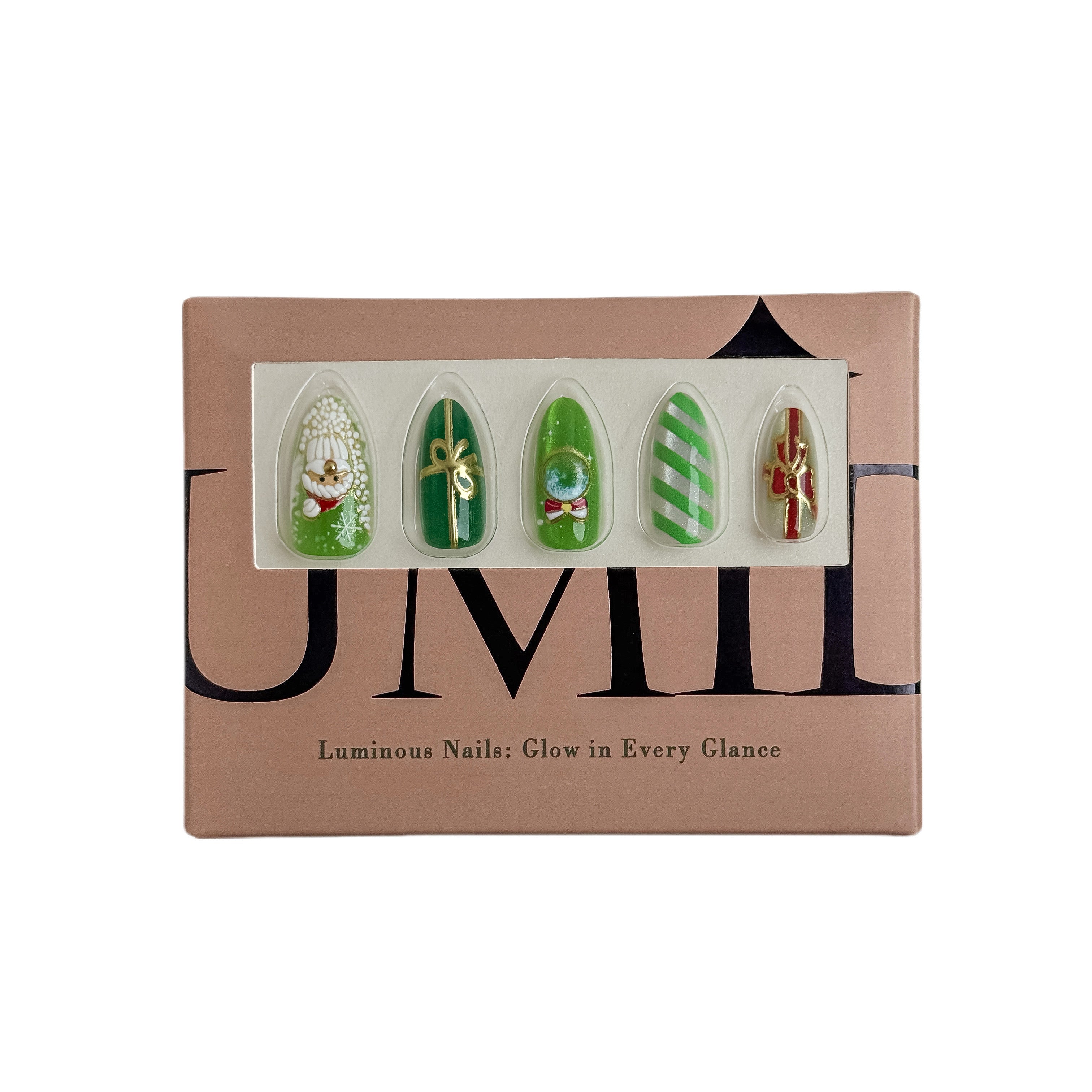 This press - on nail set showcases a vibrant Christmas theme, featuring hand-painted designs of Santa Claus, snowman, snowflakes, and festive green-and-white stripes, accented with 3D pearls, sparkling rhinestones, and metallic gold charms. The color palette centers on rich forest greens, paired with crisp white, glittering gold, and shimmery clear bases for a luxe, wintry feel. The nails are crafted in a sleek, elongated almond shape, offering a stylish, modern silhouette that suits both casual and dressy looks. Perfect for Christmas parties, holiday family gatherings, or adding a playful festive touch to your winter outfits, they bring joyful holiday spirit to every occasion.