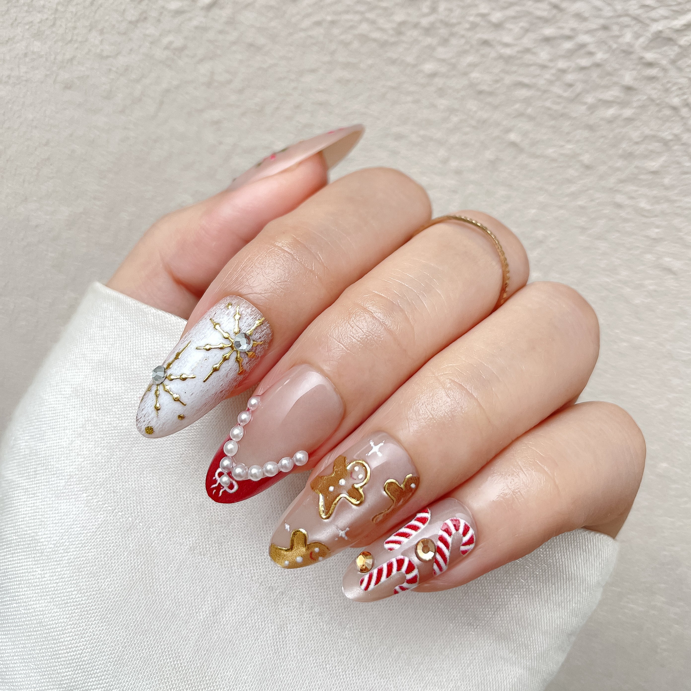 This press-on nail set boasts Christmas-themed patterns such as holly branches, golden starbursts, pearls, gingerbread men, and candy canes. In terms of color, it combines neutral tones like nude and beige with warm gold and accent red, achieving a soft and versatile effect. The nail shape is a sleek almond, which is flattering to the hands. It is suitable for daily commutes, casual gatherings, and Christmas parties, perfectly balancing festivity and everyday wearability.
