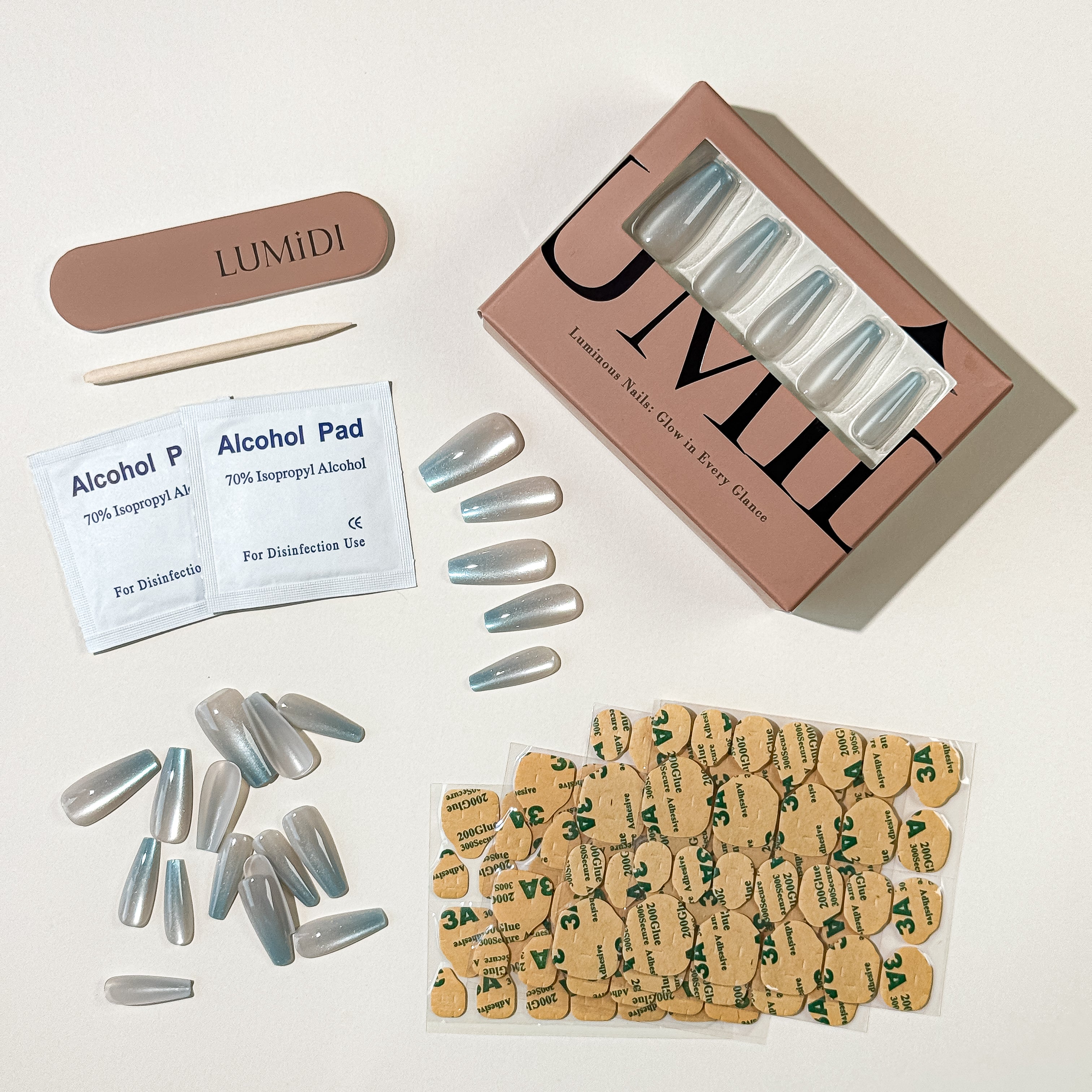 LUMIDI Tropical Breeze Ocean Holographic Gradient Cat Eye Medium Coffin Press-On Nails featuring medium coffin shape and "Ocean Tear" gradient technology from blue tip to pearl white base. Lightweight yet durable, they stay flawlessly in place for days, whether you’re hitting fashion shows, nailing a photoshoot, or just owning your daily bold look. Your hands deserve to be a canvas of self - expression—grab these press - ons and let your personality shine through!