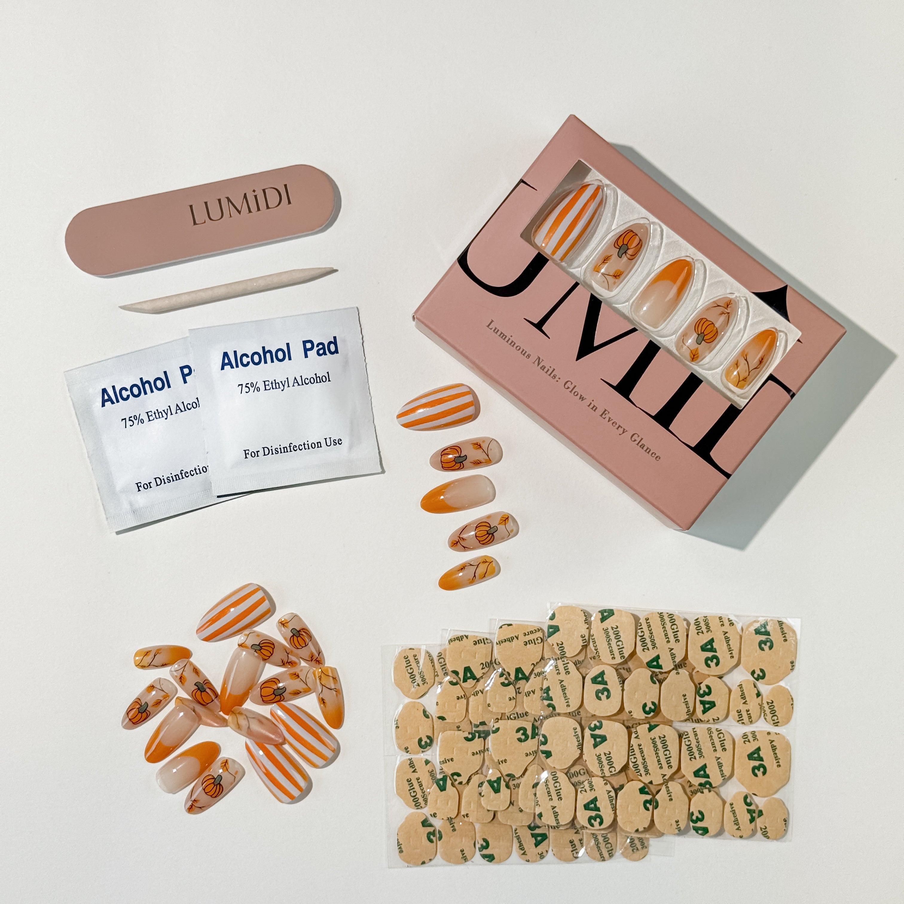 This Halloween - themed press - on nail set showcases patterns like pumpkins, autumn leaves, and stripes, which are full of the festive and autumnal atmosphere of Halloween. The colors mainly use warm tones such as orange and beige, creating a cozy and lively feel. The nail shape is an elegant almond. It's perfect for Halloween parties, autumn - themed events, or any occasion where you want to embrace the Halloween spirit with a touch of warm, seasonal charm.