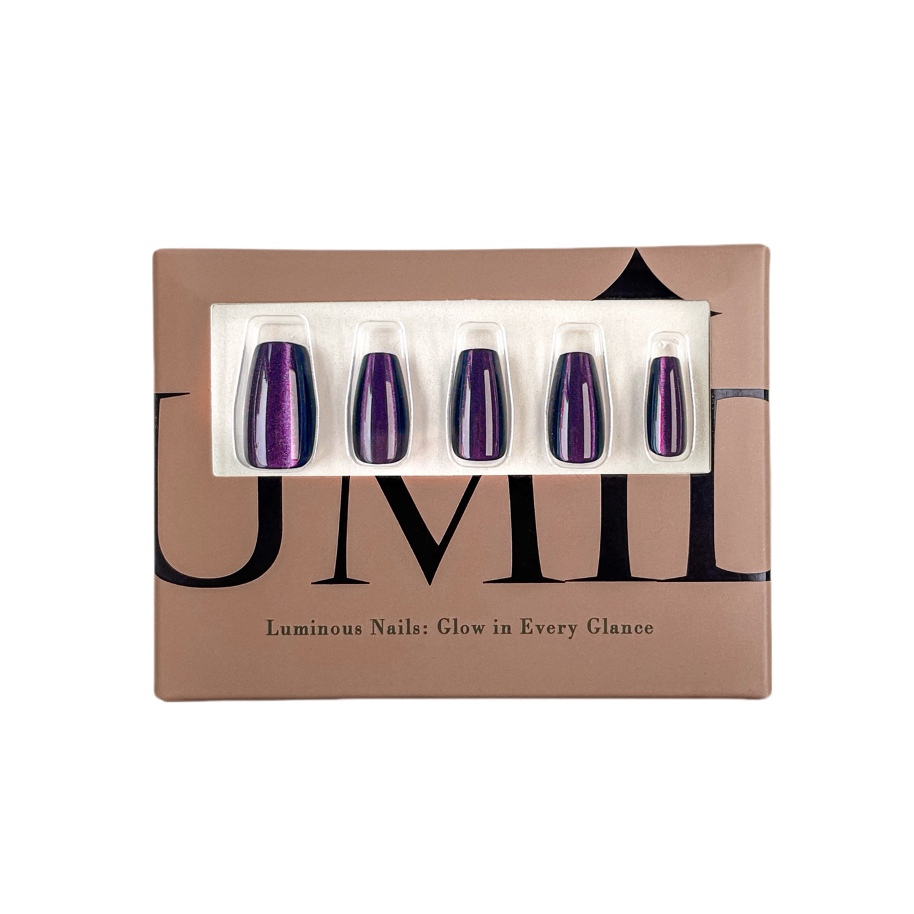 Seductive deep purple nails with an intense magnetic cat eye effect that shifts between violet and wine red hues. The medium coffin shape elongates fingers while maintaining wearability. When light hits, the 3D chrome finish creates a mesmerizing liquid metal illusion, as if molten amethyst is flowing across your nails.