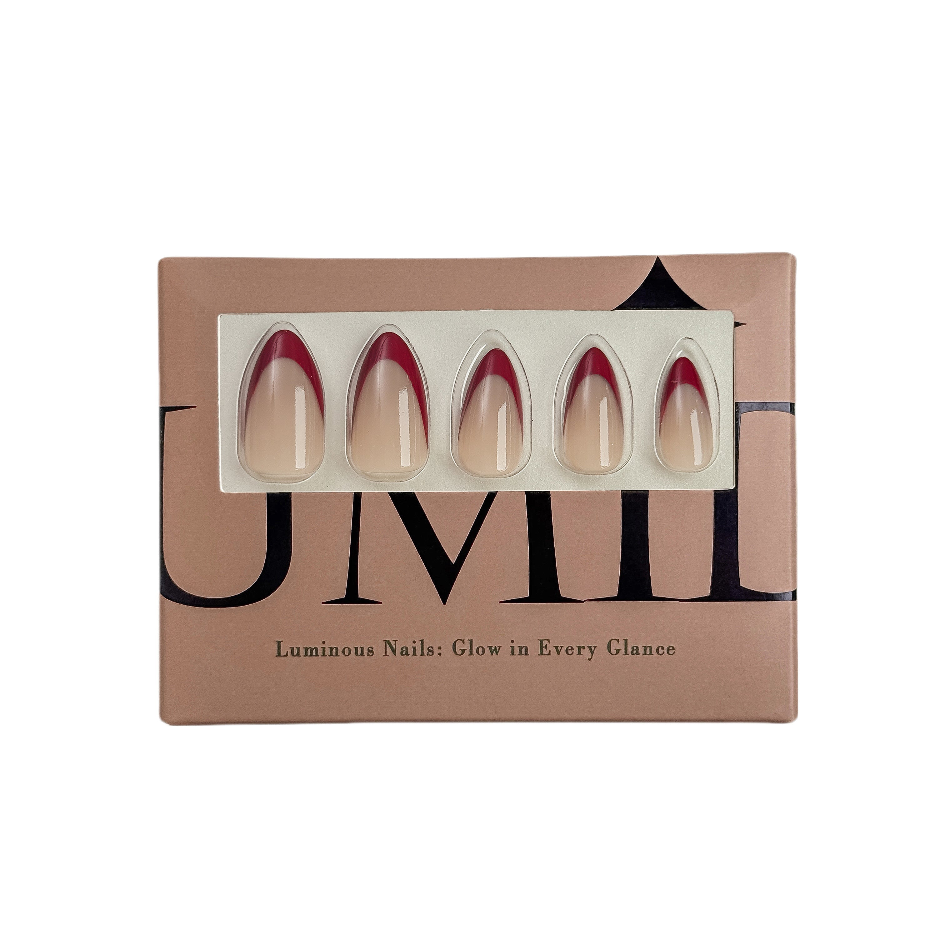These press - on nails are versatile for daily use. They have a classic French tip pattern with a striking red accent on the tips against a soft nude base. The almond - shaped nails are elegant and flattering. The color combination of nude and red is timeless, making them suitable for various daily scenarios, from work to casual outings, adding a touch of sophistication to your look.