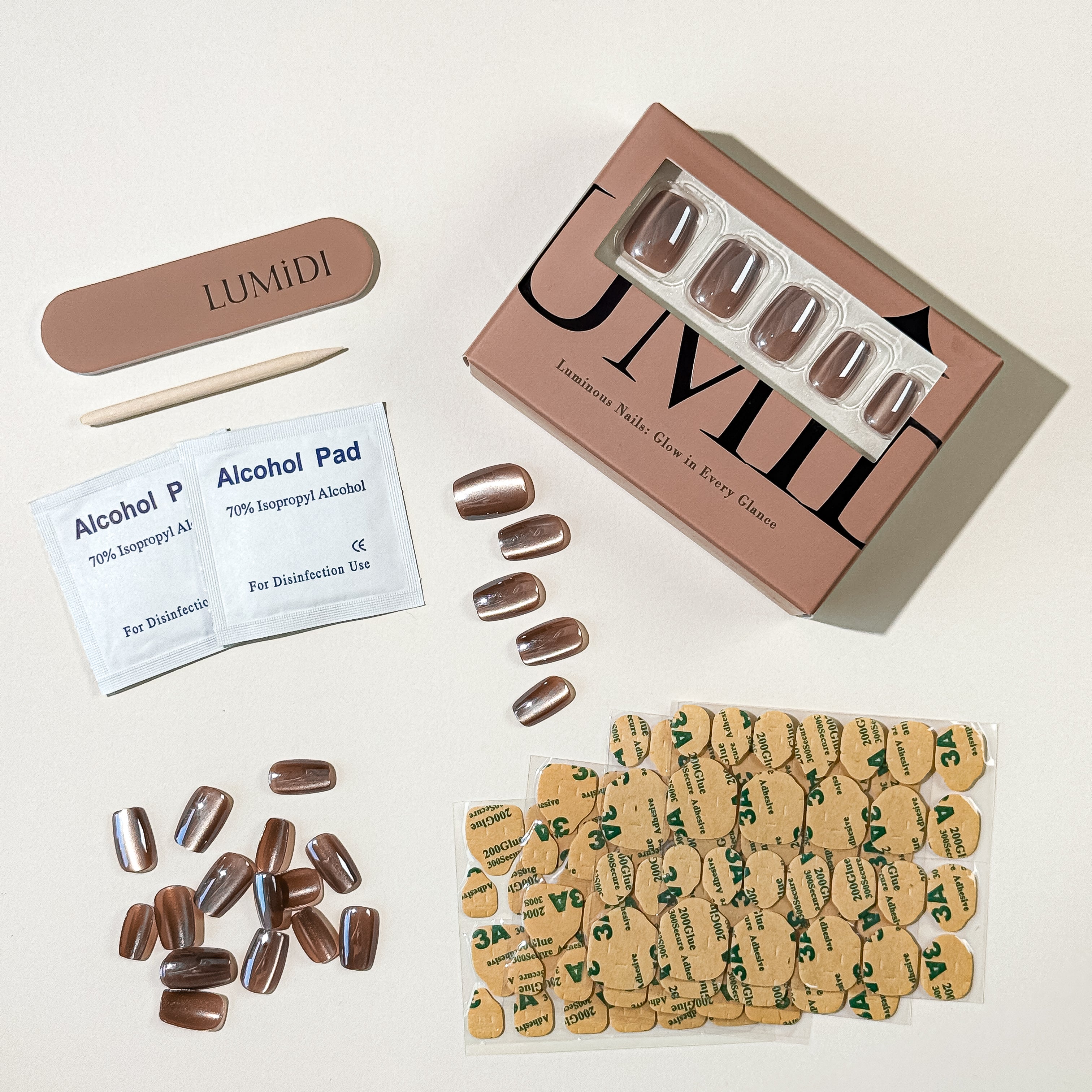 LUMIDI Tropical Breeze Rose Gold Mirror Short Coffin Press-on Nails feature aerospace-grade coating for 360° reflection. Short coffin shape with 8° side bevel elongates fingers. "Mirror Lock" technology maintains gloss. Perfect for galas and business events.