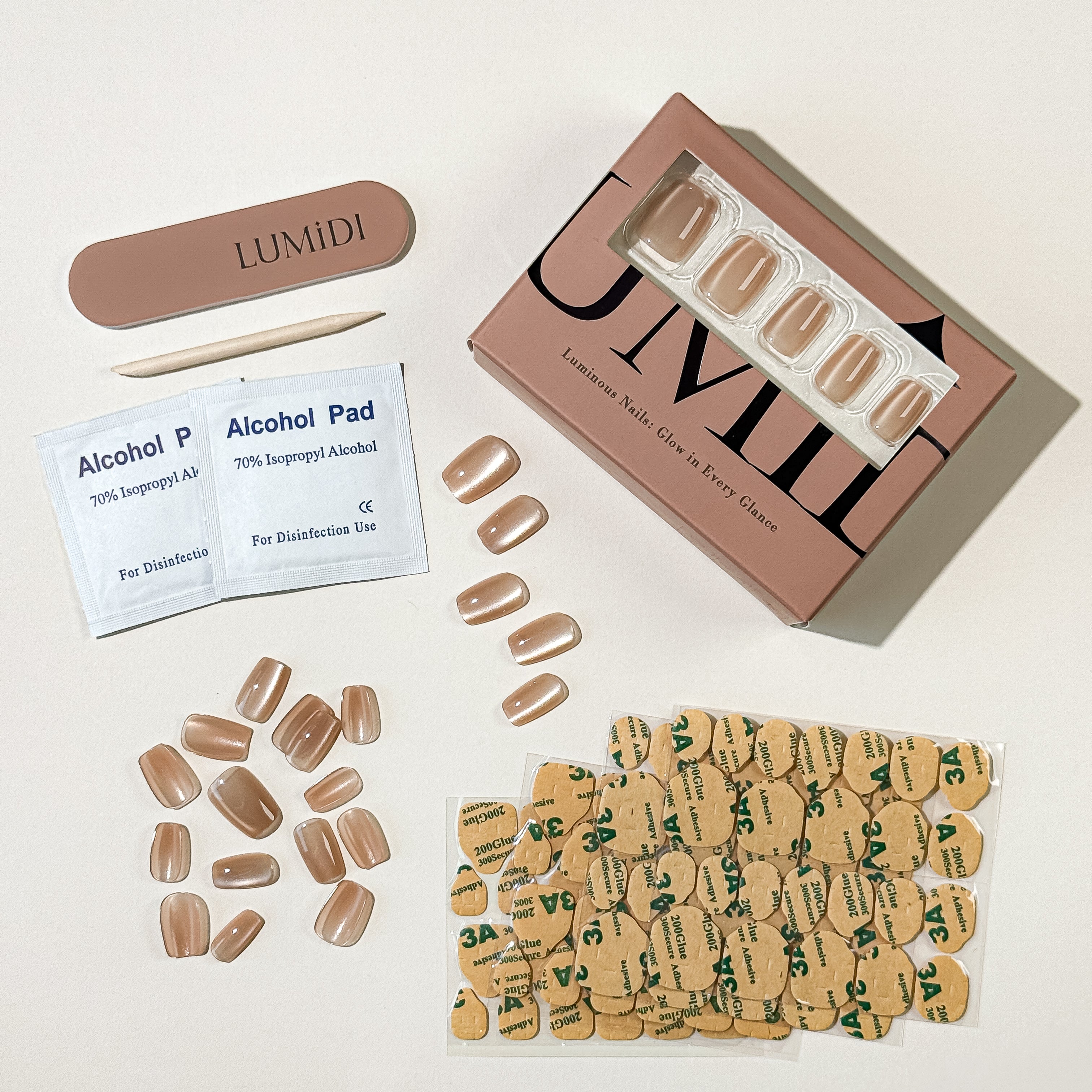 Kit Contents: Full kit: Includes premium jelly glue, wooden stick, exclusive dual-grit nail file, and alcohol prep pads.