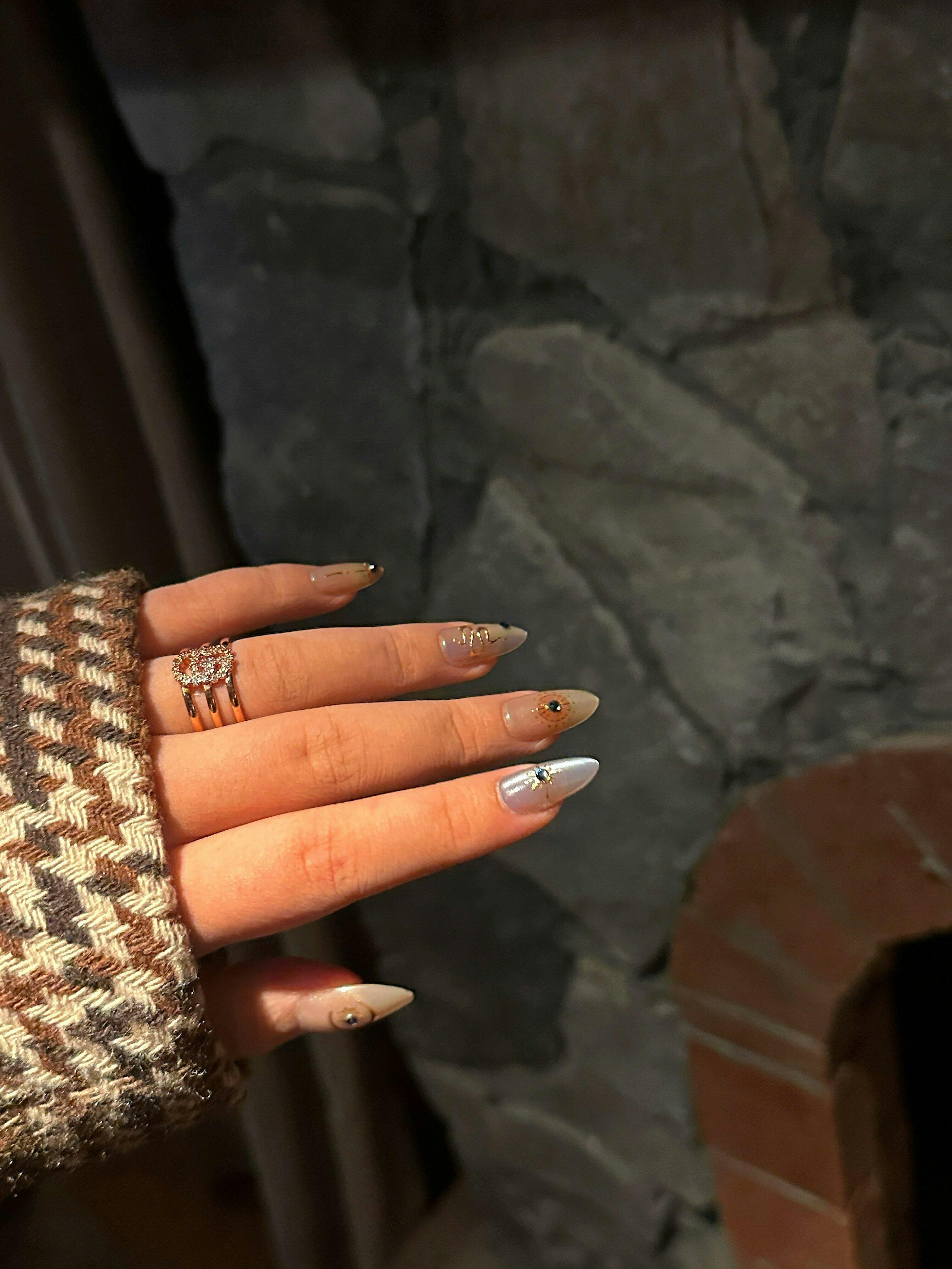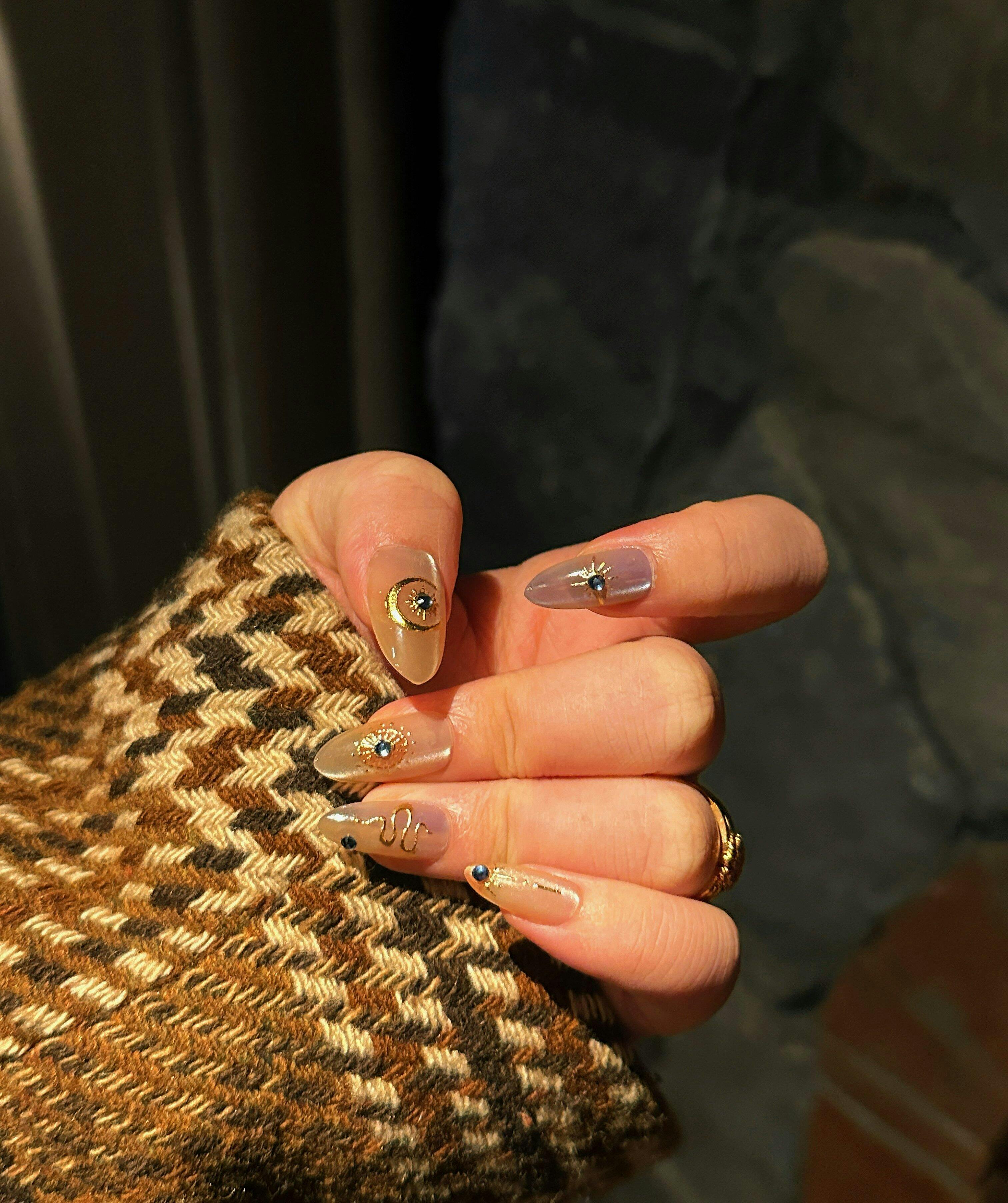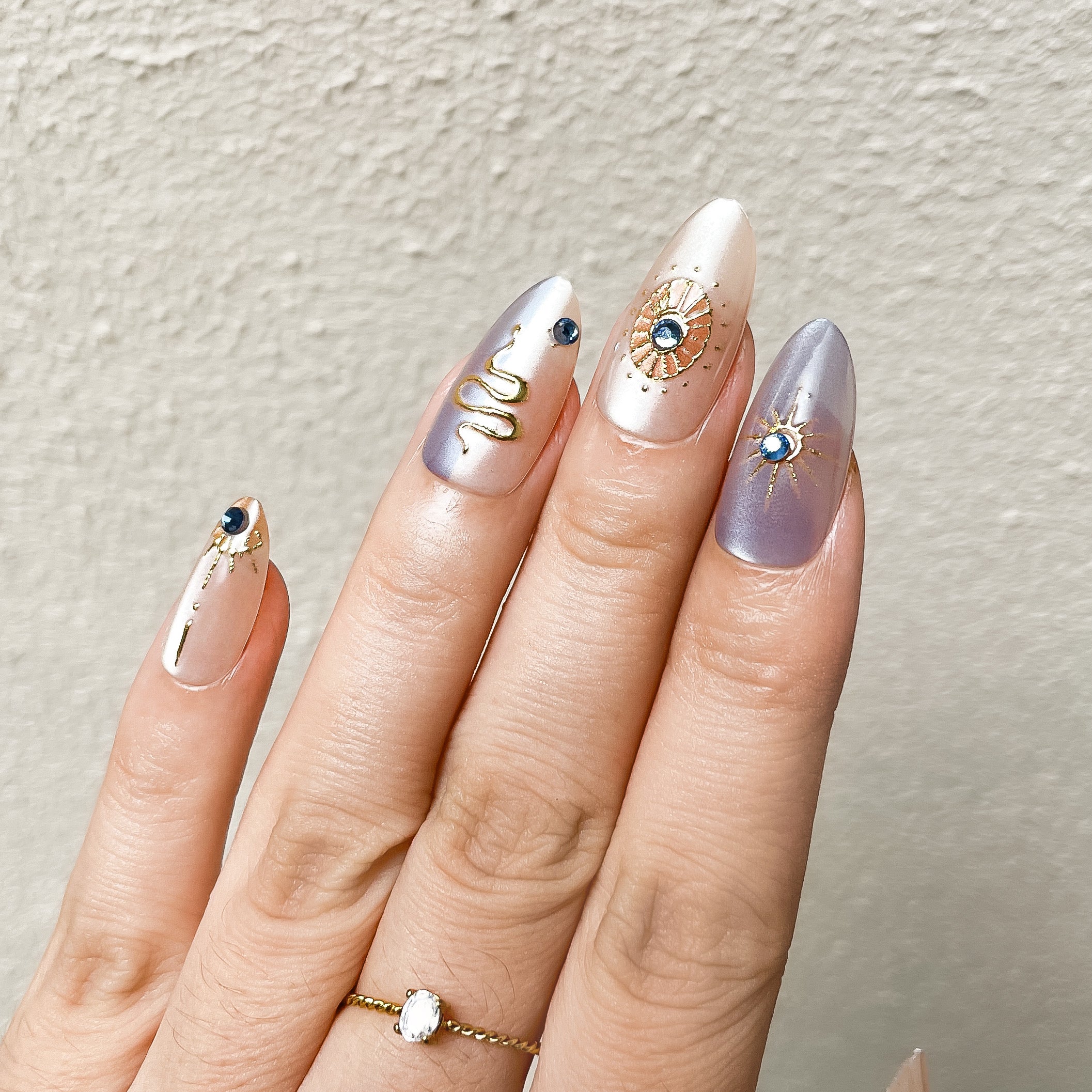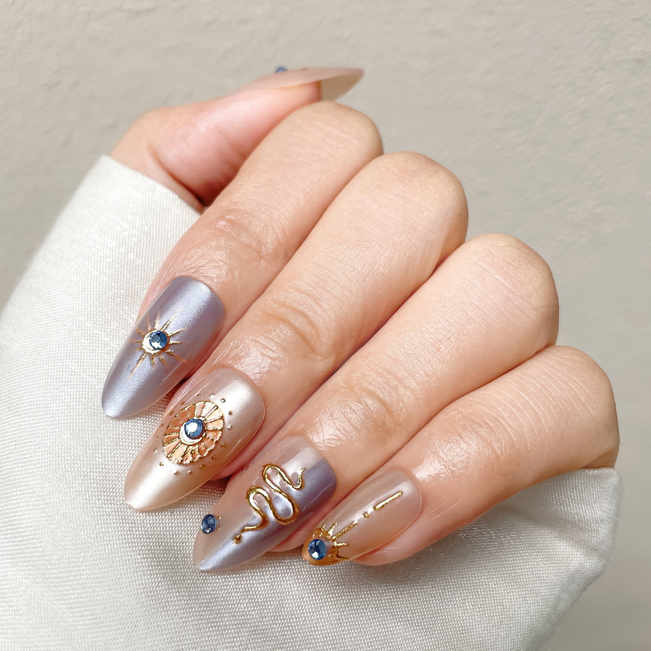 These press - on nails are versatile for daily wear. They boast unique patterns like moons, suns, snakes, and decorative gems. The colors combine soft neutrals with a touch of blue, giving a gentle and elegant feel. The almond - shaped nails are stylish and comfortable. Perfect for various daily scenarios, from work to casual hangouts, they add a touch of charm to your look.