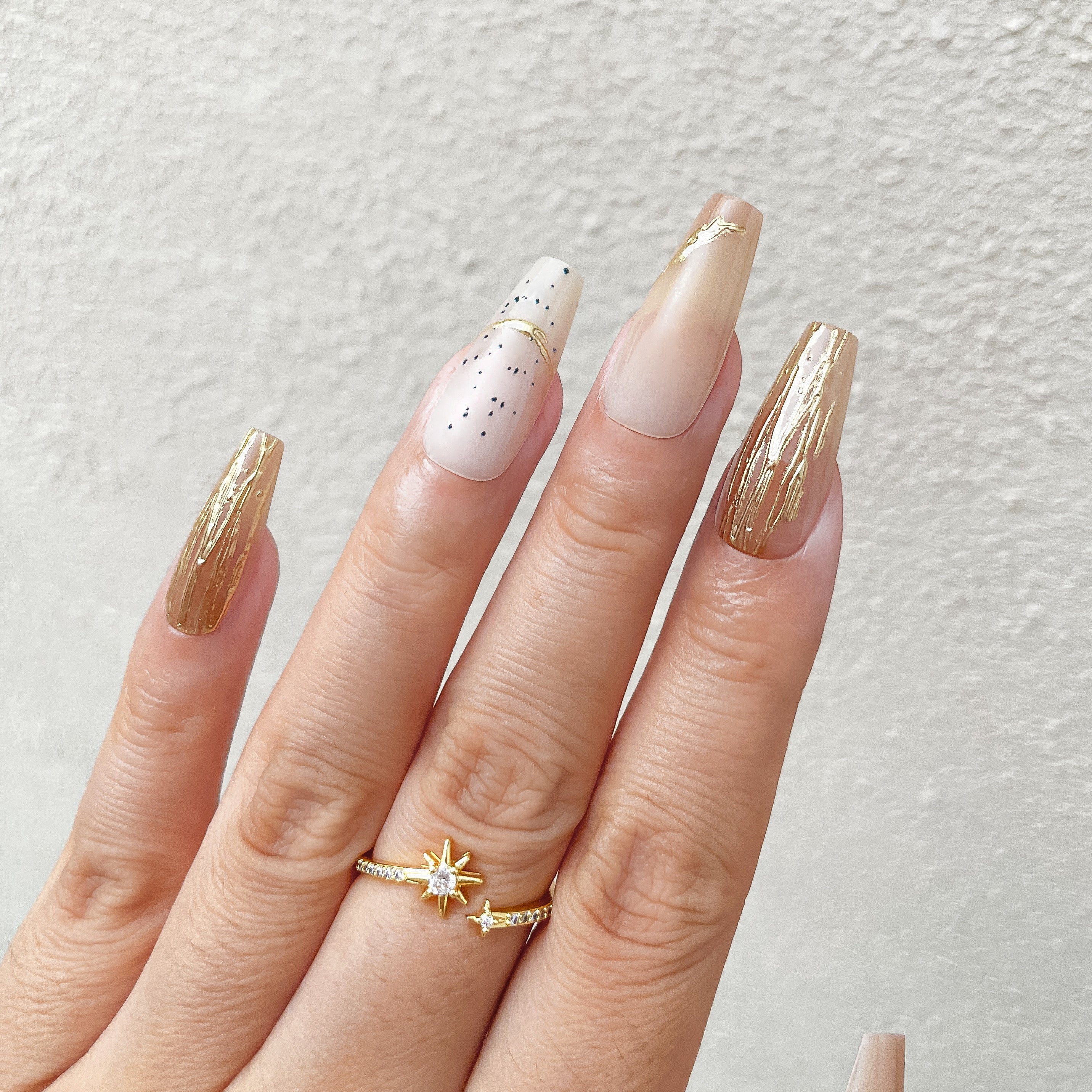 Unleash creativity with our Blush Pink Gradient with Gold Foil & Black Dots Pree on Nails from the Sveltoise Series. The blush pink gradient pairs with shimmering gold foil and playful black dots, resulting in a unique and eye - catching design. Stand out with these one - of - a - kind nails.